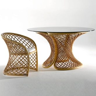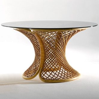 Iconic table with woven rattan structure and glass top. Available with or without clear glass top. Rattan is available in natural, matte lacquer, or glossy lacquer. Natural rattan is available with a matte or glossy finish. Designed in 1970. The same manufacturer has been producing this chair since then. The collection includes a chair. Handmade in Italy.