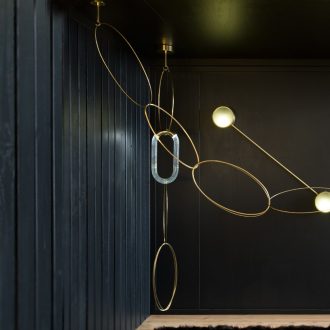 Top glass in geometric shapes, in a variety of glass colors with natural brass inlays and base brass.