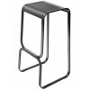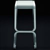 A line containing a volume or a metal paperclip. Continuum bends gently round to form a three-dimensional loop. Every element from footrest through to seat is seamlessly included in a single smooth trajectory. Stool in two heights with frame in sandblasted stainless steel or powder coated. The curved seat, gently following the frame, is available in blanched oak, black stained, white lacquered or upholstered in soft leather. Suitable for contract/high traffic and residential environments. Designed in 2011. Made in Italy.