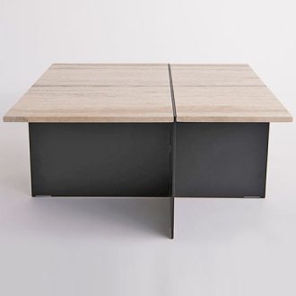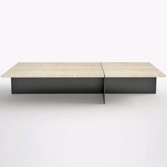 Collection of architecturally inspired side and coffee tables, fabricated out of powder-coated metal bases with travertine or marble tops. The tops are divided by a protruding metal strip, thus the name Division. Solid steel sheet available in a flat black or white powder coat finish. Powder coat finishes are available in custom colors. Travertine, white carrara, or negro marquina marble top. Marble is available with a polished or honed finish. Please note: made by hand and natural materials some imperfections are part of the process. Pictures of finishes are for reference. Made in the USA.