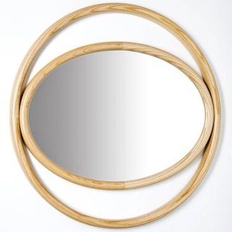 Simple geometric shapes, a combination of circles and ovals, recreate scenic suggestions that bring to mind the mystical powers of the eye and delineate the outline of the EYESHINE mirrors devised by the designer Anki Gneib. The bent ash-wood encloses the reflecting surface and shows different sizes, expanding the eye’s searching echo. 6 versions. Designed in 2015. Handmade in Italy.