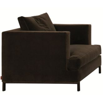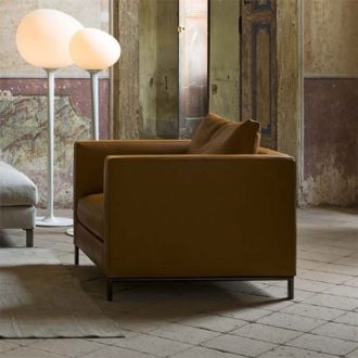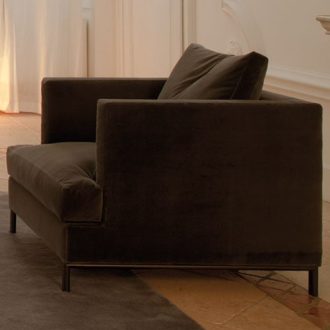 Modern comfort armchair is part of a collection of sofas with unique design features, the arms completely occupy the depth of the armchair with aluminum legs. Frame made of solid and plywood, padded with non-deformable expanded polyurethane of differentiated density, and sprung with interwoven elastic belts. Cotton lining coupled with polyester fiber. In the version without a skirt, the foot is bridge-shaped: burnished cast aluminum series and polished cast aluminum, upon request. In the version with skirting (sofas and armchair) the foot is cylindrical. Available in 2 backrest versions; version A comes with rectangular backrests along the back of sofa and version B comes with multiple loose cushions. Leg height is customizable. Backrest-cushions type “A” with canalized feather and polyurethane insert; Backrest-cushions type “B” entirely made with canalized feather. The standard seat cushions are made with canalized feather and polyurethane insert with differentiated density. The seat cushion with feather and polyurethane provides the typical special comfort of a feather, as well as a pleasantly used aspect of padding. Differentiated density polyurethane and polyester fiber seat cushions are available upon request. In both versions, and according to the modules, the seat cushions can be either unique or divided. All padding is fully lined with white fabric. Available with or without a skirt. The collection includes an armchair, sofa, and sectional sofas. Designed and handmade in Italy.