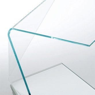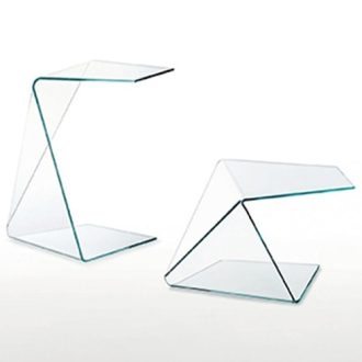 Low tables in extralight transparent glass, available in two different sizes. A complex and innovative curvature, characterized by particularly daring angles and gradients, confers great dynamism and plasticity to the low tables. The technical virtuosity is heightened by the subtle thickness of the glass, which gives the low table an extremely light appearance. Thanks to a special treatment, the glass acquires an incredible strength. Handmade in Italy.