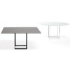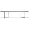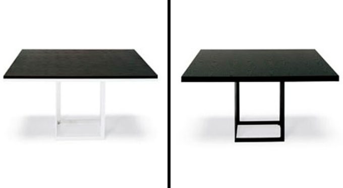 Metal frame in natural metal or lacquered. Top in rolled steel or extra clear glass lacquered in white or black. Functions as a dining table or office table.