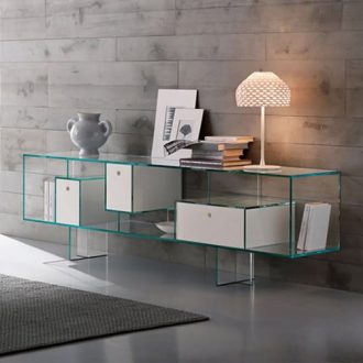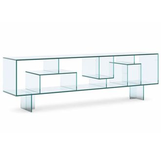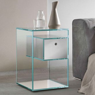 Glass bookcase or showcase with mirrored base and adjustable feet. Available in many sizes. Optional drawers are available in wood with RAL color lacquer. Maximum weight per shelf: 30pounds. The collection includes: nightstand, side tables or shelving. Introduced in 2013. Made in Italy.