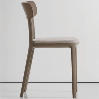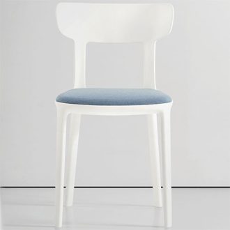 Monobloc stacking chair with polypropylene frame, upholstered seat. Stacks four high in a pinwheel formation. GREENGUARD Certified. Suitable for contract/high traffic or residential projects. Handmade in the USA.