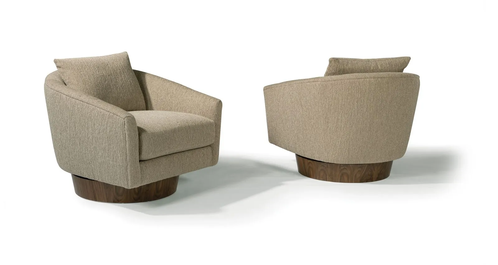 Our Revolution swivel lounge chair by Ransom Culler strikes a refined balance of comfort and craftsmanship. With a tight foam and fiber back, a loose knife-edge back pillow filled with Trillium, and a plush poly-blend down seat cushion, Revolution offers relaxed yet supportive seating. Thoughtful tailoring includes a graceful pleat at the arm fronts and precise double-needle stitching along the inside and outside backs and loose seat.