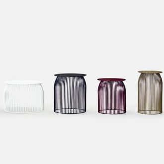 An unusual coffee table in four versions differs from each other in height and diameter of the top. Made with 64 round-section steel rods, bent and joined together by two rings and then completed with a steel top. Seven colored paint finishes. Designed in 2012. Handmade in Italy.